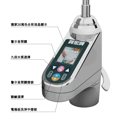 OLED全彩液晶圖像顯示 採用26萬色全彩液晶圖像顯示,圖形與文字模式交換顯示(約15秒間隔) 人體工學設計,視角無限制 高科技材質雙白金電極板 業界首創飲用出水管潔淨系統 ORP與雙PH值顯示 廚下型安裝設計檯面超清爽 內裝奈米銀離子活性碳除鉛、除菌濾心、中空絲膜電源電壓:AC110V 60Hz 機體尺寸:寬250×高310×深120×(mm) 重量:約5kg 電解方式:連續性電解方式(內藏流量感應器)電解能力:9段設定(淨水及1-4段鹼性水、1-4段酸性水) 電解槽:兩面電極 電極洗淨:依微電腦控制的自動清洗方式(配合使用水流量清洗) 淨水器:銀添活性碳抑菌效果 防止溫度過高裝置:內藏式溫度感應器 前置過濾:雙道UF-72淨水器